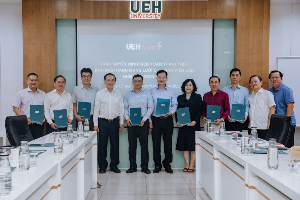Tại buổi họp, GS.TS Nguyễn Đông Phong - Chủ tịch Hội đồng Đại học, Chủ tịch UEH Alumni đã trao quyết định bổ sung thường trực và thành viên Ban Điều hành Mạng lưới cựu sinh viên UEH nhiệm kỳ 2020-2025 như sau: