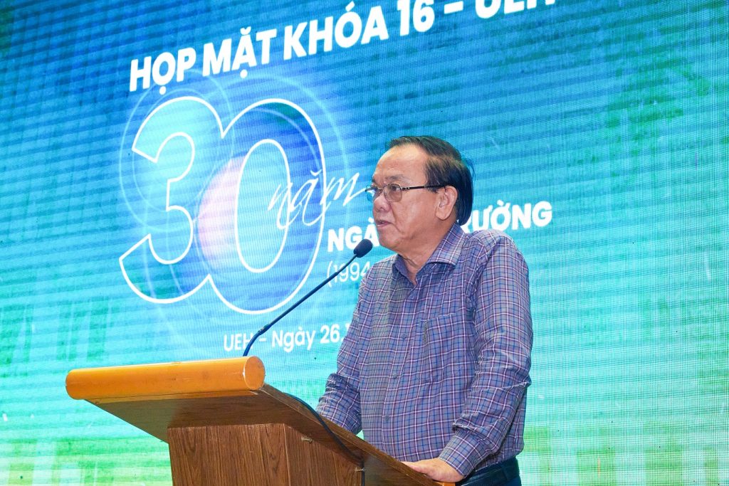 Trong phần phát biểu, GS.TS. Nguyễn Đông Phong đã chia sẻ những lời tâm huyết, bày tỏ niềm tự hào khi thấy các cựu sinh viên UEH Khóa 16 thành công và trưởng thành trên con đường riêng.
