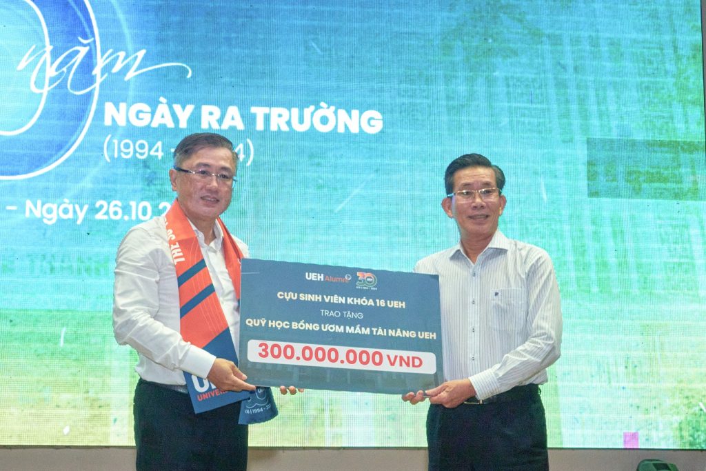 Đặc biệt, các cựu sinh viên Khóa 16 đã trao tặng nhà trường học bổng Ươm mầm tài năng UEH trị giá 300 triệu đồng nhằm hỗ trợ cho các sinh viên có hoàn cảnh khó khăn, tiếp thêm động lực để các em vững bước trên hành trình chinh phục tri thức và hiện thực hóa ước mơ. Đây không chỉ là sự hỗ trợ tài chính mà còn là món quà tinh thần quý giá, thể hiện tình yêu thương và trách nhiệm xã hội của thế hệ đi trước đối với thế hệ kế tiếp.