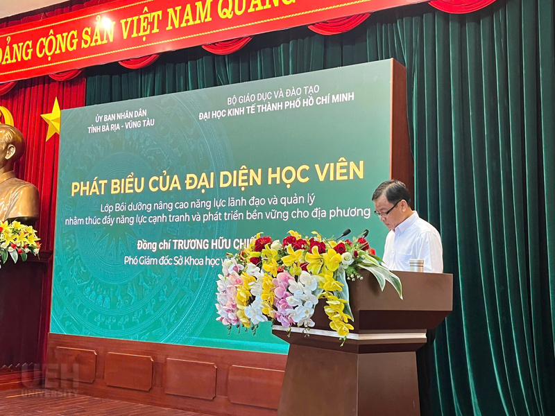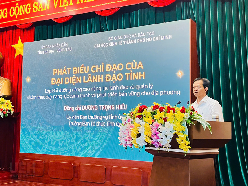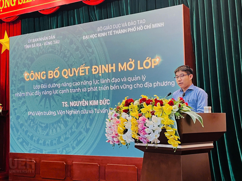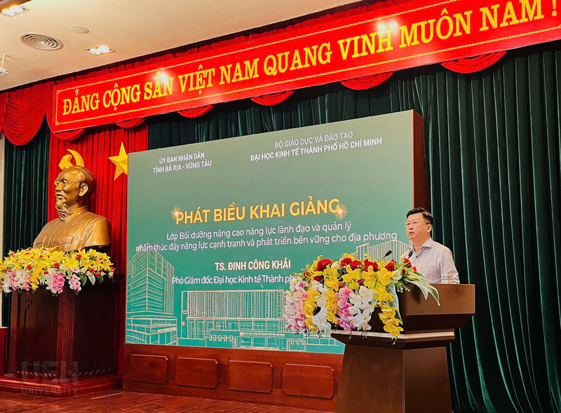 Phát biểu khai giảng chương trình, TS. Đinh Công Khải - Phó Giám đốc UEH nhấn mạnh bối cảnh thế giới và trong nước đang đặt ra nhiều thách thức đối với phát triển địa phương, đặc biệt là yêu cầu đổi mới trong tư duy quản lý, thích ứng với chuyển đổi số và nâng cao năng lực cạnh tranh để thực thi và triển khai 4 Nghị quyết trụ cột của đất nước. Bên cạnh đó, TS. Đinh Công Khải cũng chia sẻ chương trình bồi dưỡng kỳ này là dịp để Tỉnh nhìn lại chặng đường phát triển nhiệm kỳ 2020-2025, nhận dạng những điểm nghẽn ảnh hưởng đến năng lực cạnh tranh cũng như phát triển bền vững của Tỉnh, từ đó có những ý tưởng, sáng kiến, giải pháp tháo gỡ những khó khăn chuẩn bị cho nhiệm kỳ mới, đặc biệt là những giải pháp đột phá, có tính chất liên kết vùng trong bối cảnh có những thuận lợi về đổi mới thể chế, kết nối giao thông và cộng hưởng nguồn lực khi sáp nhập các tỉnh. Điều này có ý nghĩa đặc biệt trong việc thực hiện những chỉ đạo quyết liệt của đồng chí Tổng Bí thư trong việc xây dựng lại hệ thống chính trị với tiêu đề: “Tinh - Gọn - Mạnh - Hiệu năng - Hiệu lực - Hiệu quả” đảm bảo thực hiện thành công các chiến lược tăng trưởng theo hướng phát triển bền vững và liên kết vùng theo Nghị quyết số 24 của Bộ Chính trị.