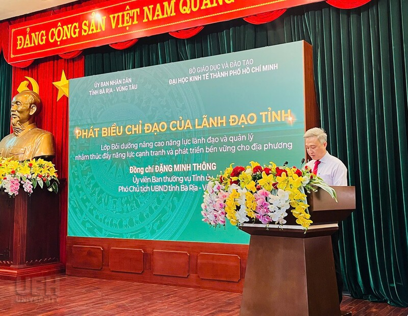 Phát biểu chỉ đạo tại Lễ khai giảng, đồng chí Đặng Minh Thông - Ủy viên Ban Thường vụ Tỉnh ủy, Phó Chủ tịch UBND tỉnh Bà Rịa - Vũng Tàu nhấn mạnh, trong bối cảnh Tỉnh đang tích cực thực hiện các chủ trương lớn về cải cách hành chính, sắp xếp đơn vị hành chính cấp Tỉnh và đẩy mạnh liên kết vùng, việc nâng cao năng lực tư duy hệ thống, quản lý liên vùng và khả năng điều hành thực tiễn của đội ngũ cán bộ là yêu cầu cấp thiết. Đồng chí đề nghị các học viên tham gia khóa học với tinh thần cầu thị, chủ động trao đổi, học hỏi và vận dụng sáng tạo kiến thức vào công tác thực tiễn, góp phần nâng cao chất lượng quản lý, điều hành tại đơn vị và địa phương.