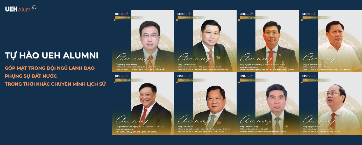 Họ chính là những đại diện tiêu biểu cho tinh thần UEH: trách nhiệm, bản lĩnh, hội nhập và cống hiến. UEH Alumni trân trọng gửi lời chúc mừng nồng nhiệt đến các cựu sinh viên đang đảm nhiệm vai trò lãnh đạo trong giai đoạn lịch sử quan trọng này - chúc các anh, chị tiếp tục công tác thật tốt, lan toả giá trị tích cực và đóng góp hiệu quả vào sự phát triển bền vững của các địa phương trên hành trình mới.