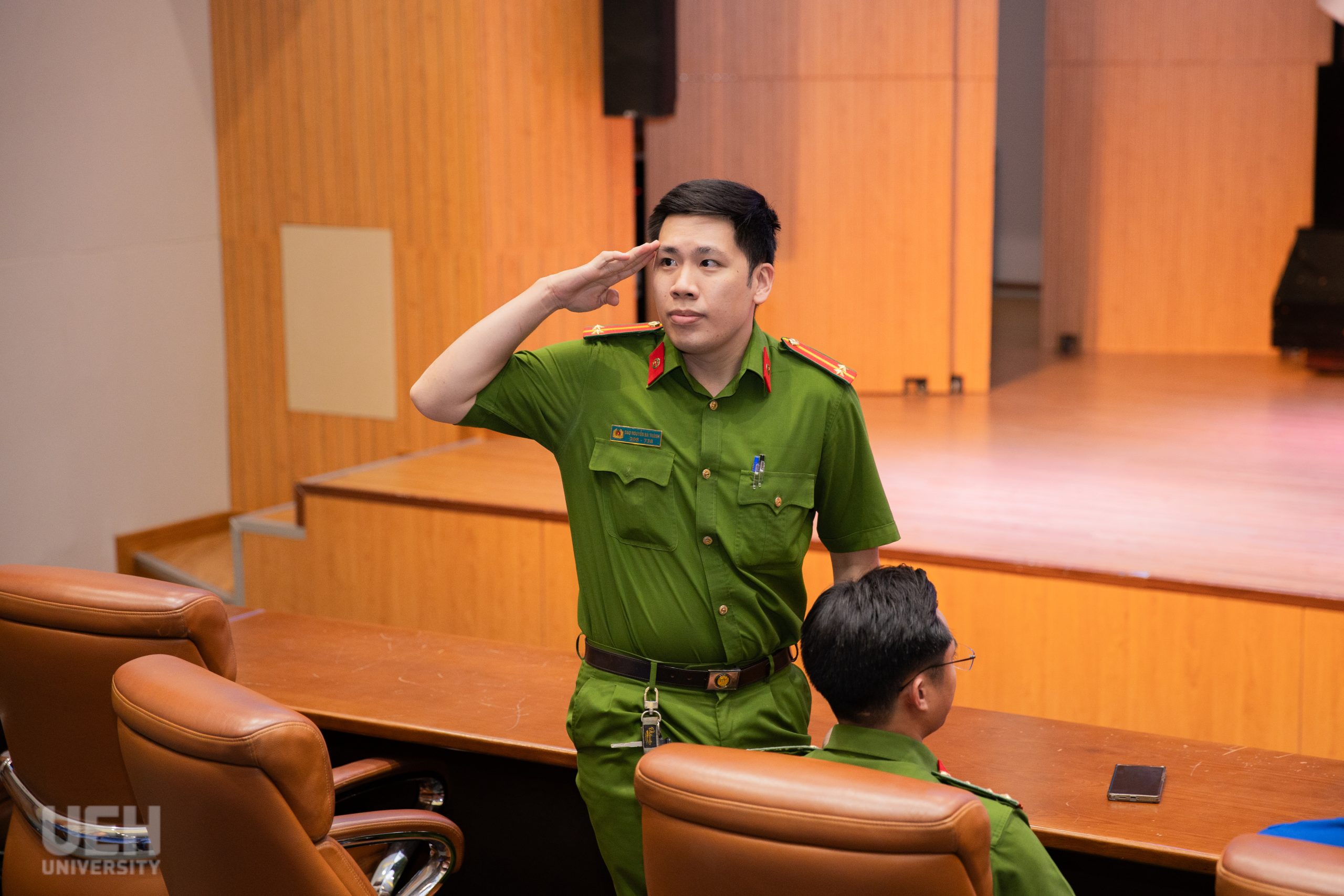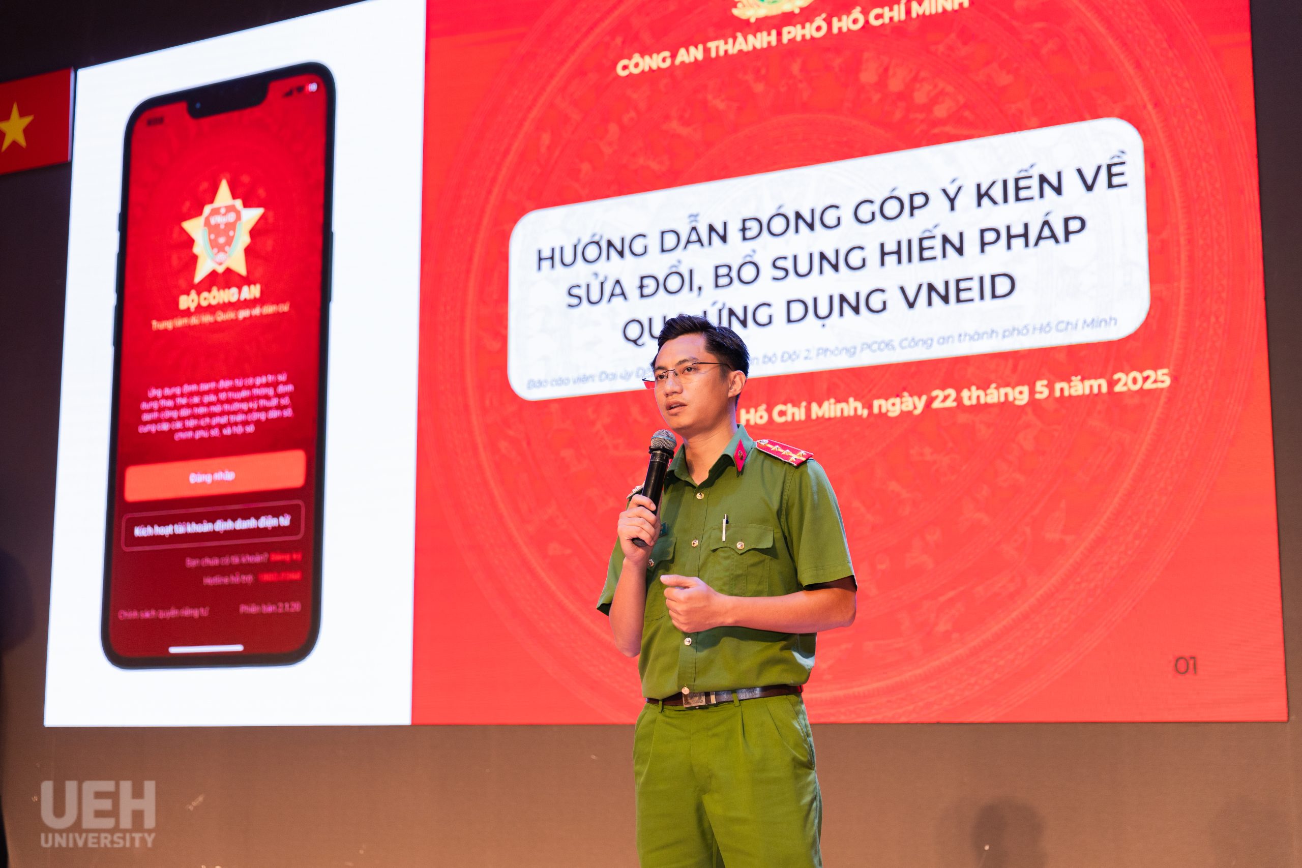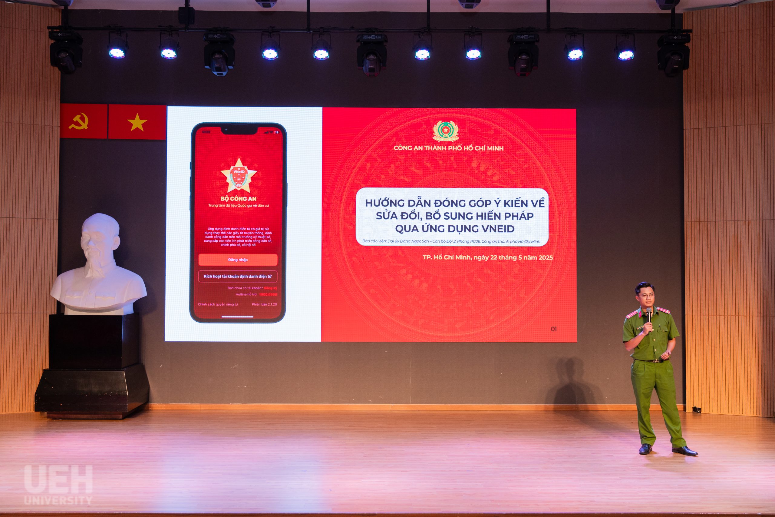 Mở đầu chương trình là chuyên đề “Hướng dẫn đóng góp ý kiến về sửa đổi, bổ sung một số điều của Hiến pháp năm 2013 thông qua ứng dụng VNeID” do Đại úy Đặng Ngọc Sơn, đại diện Phòng PC06 Công an TP.HCM trình bày. Phần hướng dẫn đã mang đến cho sinh viên UEH cái nhìn thực tiễn về quyền và nghĩa vụ công dân trong bối cảnh chuyển đổi số, góp phần nâng cao hiểu biết chính trị – pháp luật, hướng đến xây dựng hình ảnh sinh viên UEH trách nhiệm, chủ động và hội nhập. Đồng thời, giúp các đồng chí trong Ban Thường vụ – Ban Thư ký các đơn vị cơ sở hiểu và nắm rõ để triển khai đến rộng rãi sinh viên khoa.