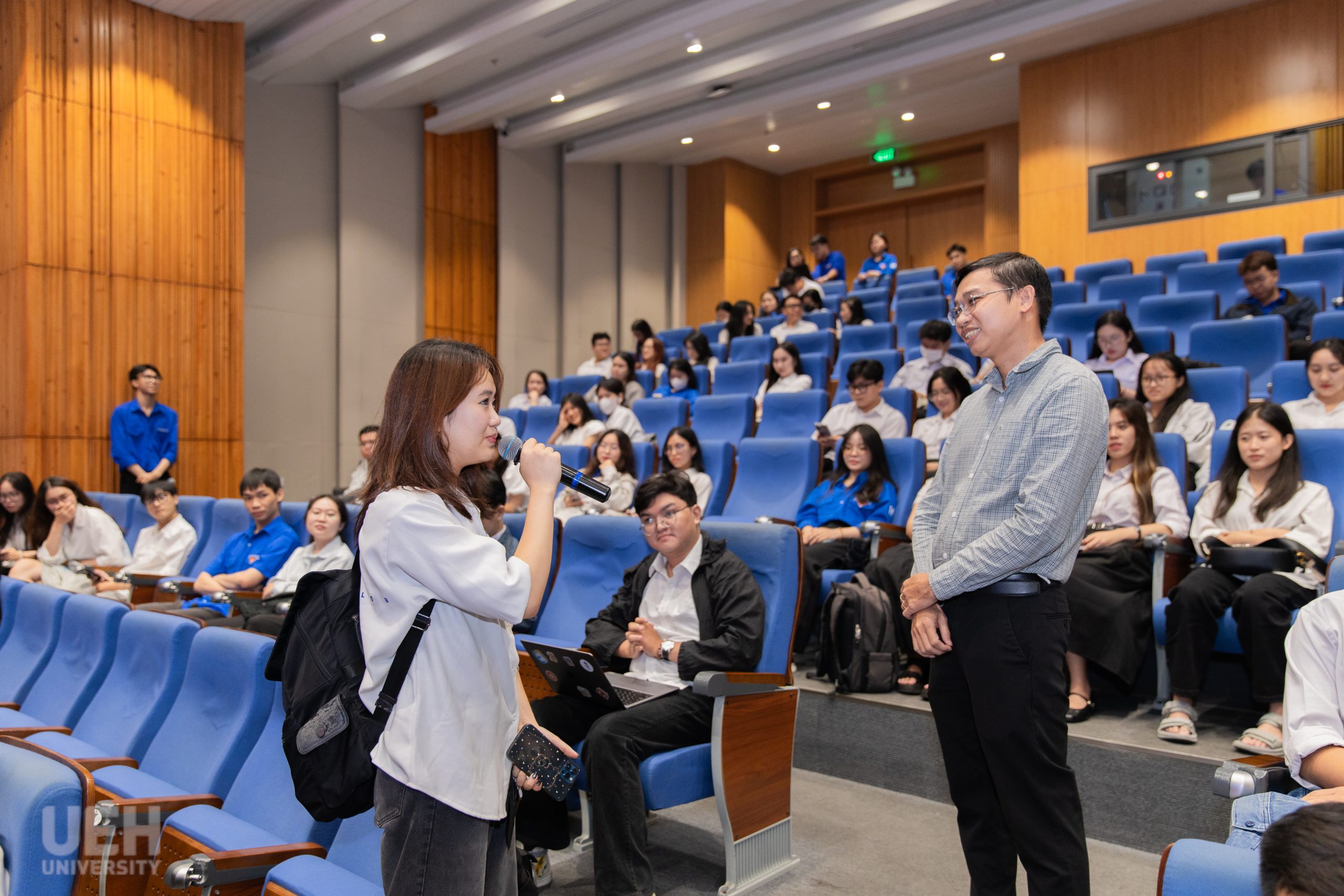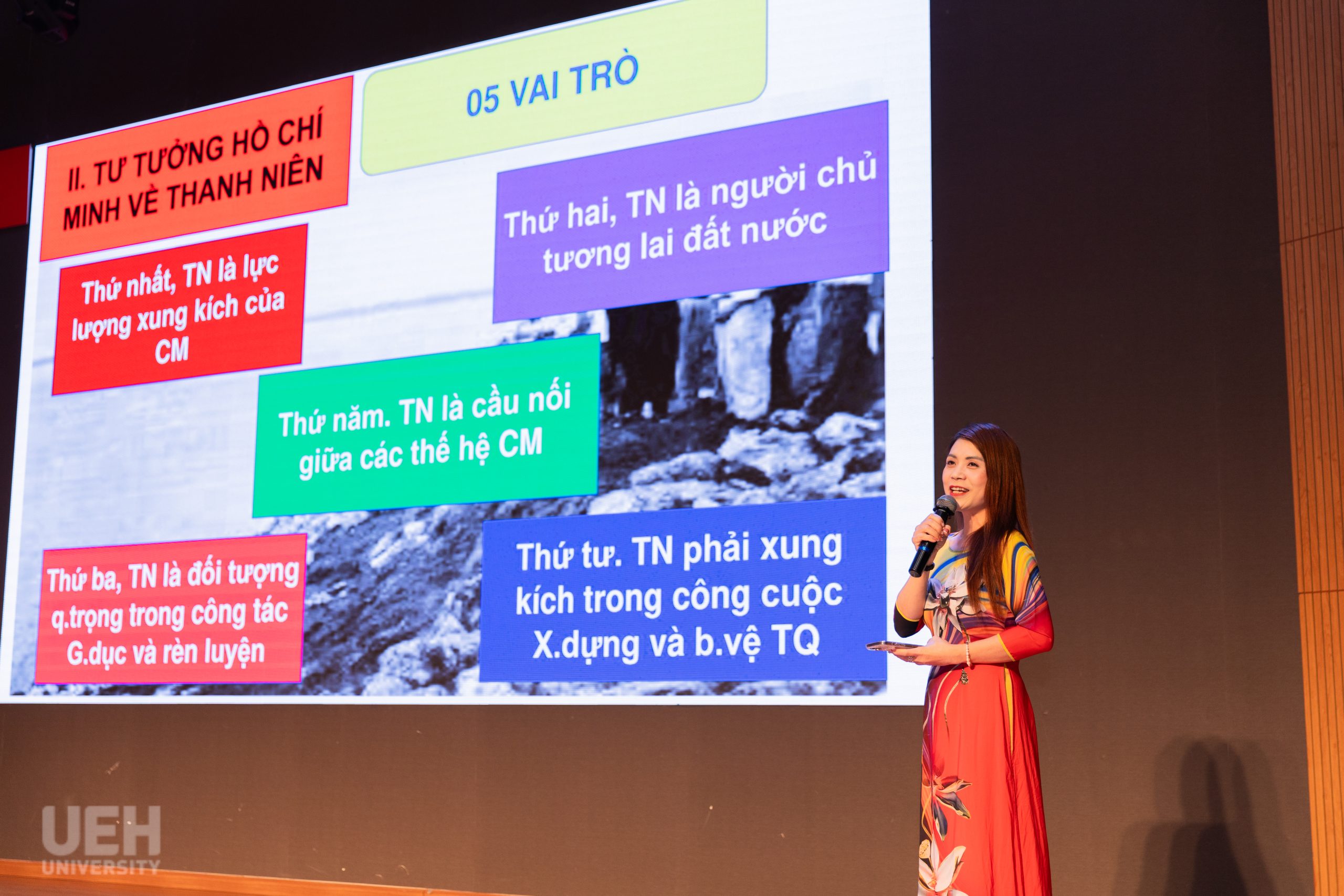 ThS. Nguyễn Thị Thảo Nguyên chia sẻ với sinh viên về chủ đề “Từ tư tưởng Hồ Chí Minh đến hành động của tuổi trẻ UEH – Khơi dậy bản lĩnh, kiến tạo tương lai”