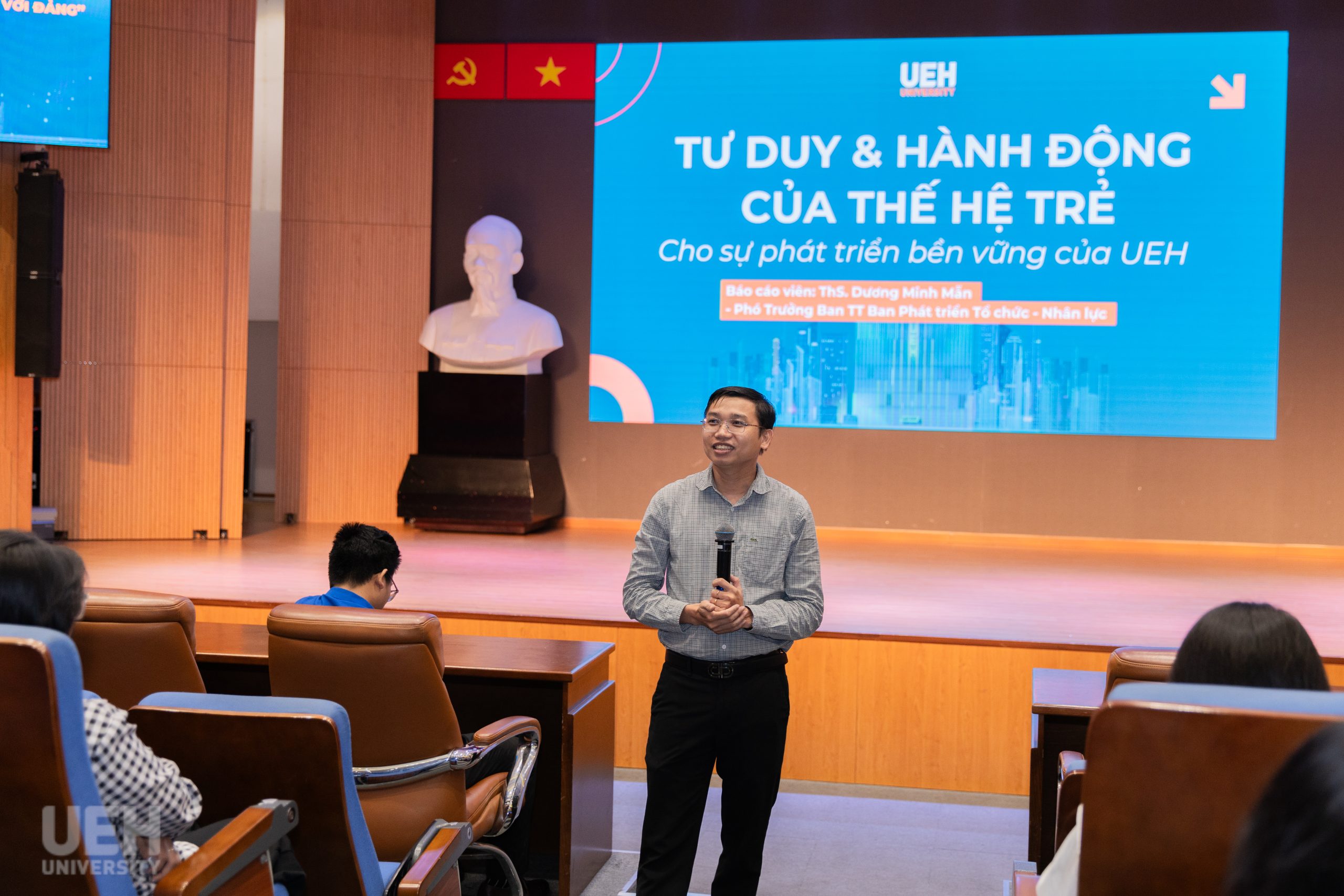 ThS. Dương Minh Mẫn – Phó Trưởng Ban Thường trực Ban Phát triển tổ chức – nhân lực chia sẻ về chủ đề “Tư duy và hành động của thế hệ trẻ cho sự phát triển của UEH”