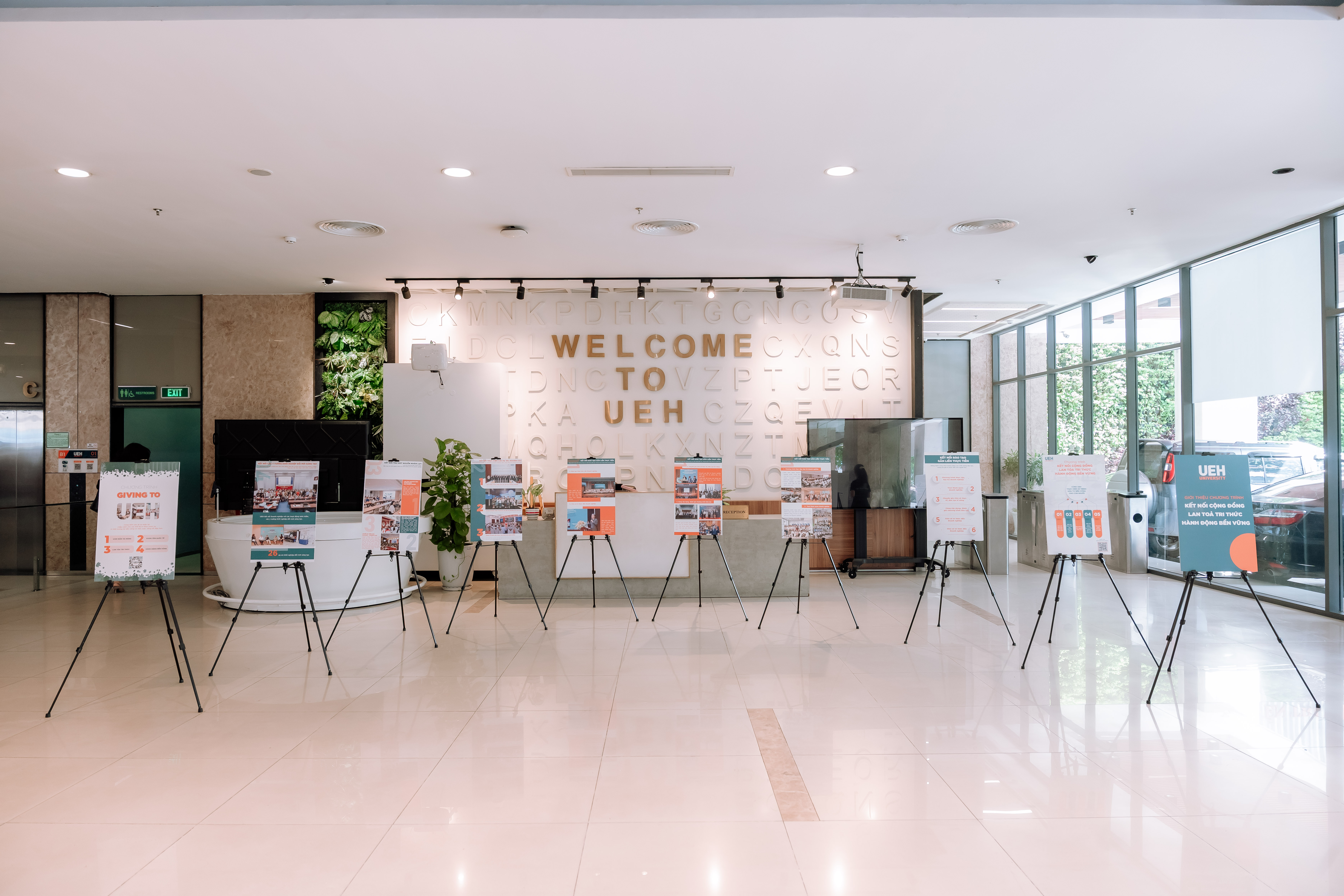 Sôi nổi các hoạt động tại sảnh: Triển lãm giới thiệu chương trình Kết nối cộng đồng - Lan tỏa tri thức - Hành động bền vững của UEH và booth tư vấn của các doanh nghiệp.