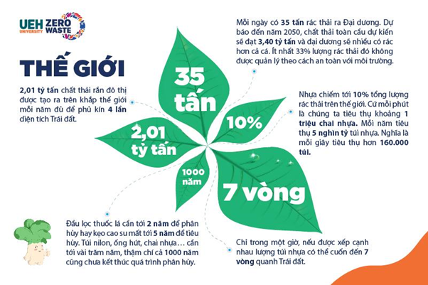 Có thể bạn chưa biết, có tới 9.000.000 người tử vong do ô nhiễm chiếm ⅙ ca tử vong trên toàn thế giới, thêm vào đó khoảng 325.000.000 người bị ảnh hưởng bởi những chuyển biến tiêu cực của môi trường. Và nếu tình trạng này vẫn còn tiếp diễn thì theo dự đoán mức nhiệt độ trung bình của trái đất sẽ tăng 4% trước năm 2100. Đến đây chắc hẳn ai cũng nhận ra 100% rác thải trên thế giới này là do con người tạo ra rồi đúng không? Vậy thì tại sao chúng ta không bắt tay vào để giải quyết vấn đề này ngay và luôn tại khuôn viên UEH. Hãy cùng đồng hành với UEH Zero Waste Campus ngày hôm nay.