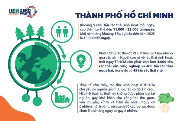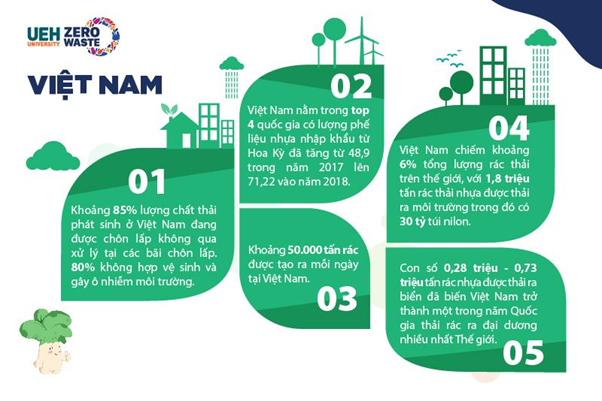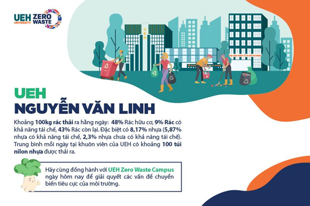 Trong cuộc kiểm toán rác của UEH kết hợp VZWA vào tháng 04/2021 tại UEH Nguyễn Văn Linh đã đưa ra các số liệu. Khoảng 100kg rác thải ra hằng ngày tại UEH Nguyễn Văn Linh, trong đó Rác hữu cơ: 48%, Rác có khả năng tái chế: 9%, Rác còn lại: 43%. Đặc biệt nhựa 8,17% (nhựa có khả năng tái chế: 5,87%, chưa có khả năng tái chế: 2,3%). Và trung bình mỗi ngày tại khuôn viên của UEH có khoảng 100 túi nilon nhựa được thải ra.