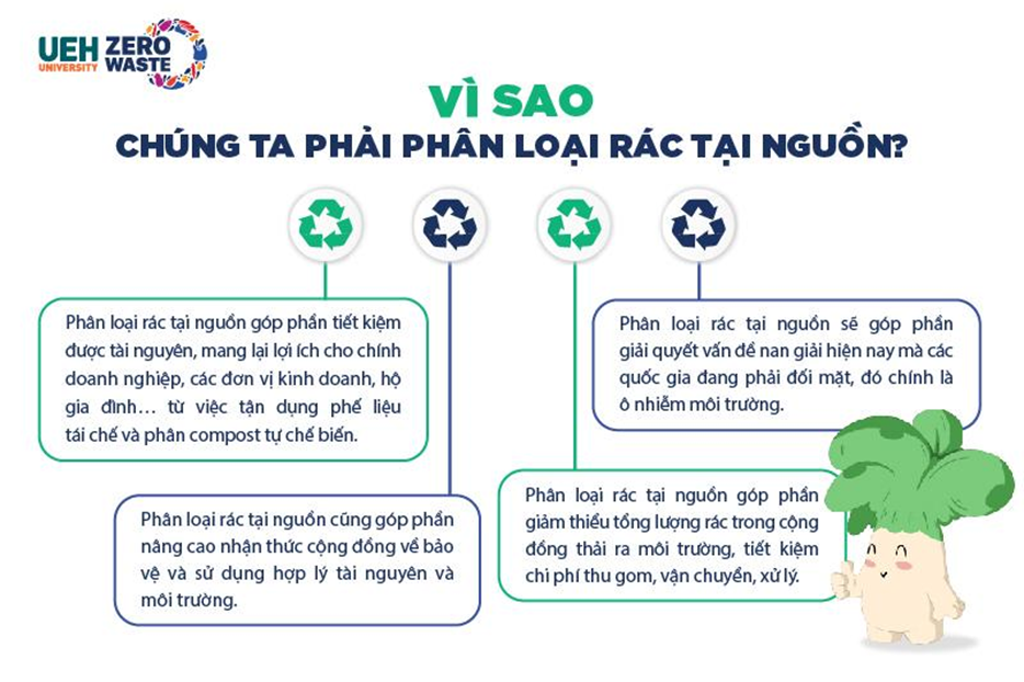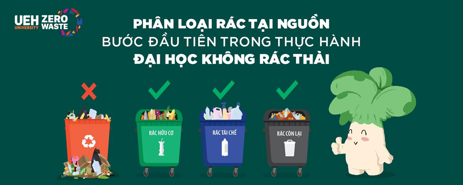 Ngày nay, phân loại rác tại nguồn là một việc vô cùng quan trọng và cấp bách cần được thực hiện tại các hộ gia đình, doanh nghiệp, trường học…nhằm giảm thiểu lượng rác ra ngoài đô thị, xử lý rác có quy trình hơn, trách nhiệm hơn tránh gây ô nhiễm môi trường. Một trong những mục tiêu chính của dự án Living Lab “UEH - Zero Waste Campus” là biết cách phân đúng loại rác tại nguồn và ứng dụng mô hình 3R (Reduce - Reuse - Recycle) trong quản lý rác bền vững, mang lại môi trường học tập và đời sống xanh sạch đẹp hơn.