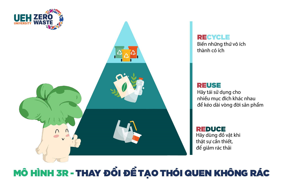 Mô hình 3R là một cách đơn giản để nhắc nhở chúng ta cách tạo ra sự thay đổi bền vững. Mô hình giúp chúng ta từng bước hình thành thói quen không rác thải mỗi ngày thông qua việc thực hành 3 bước gồm Reduce - giảm, Reuse - Tái sử dụng, Recycle - Tái chế. Trong đó, Reduce và Reuse được xem là những hoạt động trọng tâm & nền tảng. Hoạt động Recycle - Tái chế phụ thuộc vào trình độ công nghệ, quản lý và tái chế có thể gây nên các tác động tiêu cực khác (side effects) như ô nhiễm không khí hay cạn kiệt nguồn nước. Việc áp dụng mô hình 3R vào quản lý chất thải bền vững tại UEH có thể tác động tích cực đến môi trường thải bằng cách giảm đáng kể lượng chất thải mà cộng đồng UEH tạo ra.