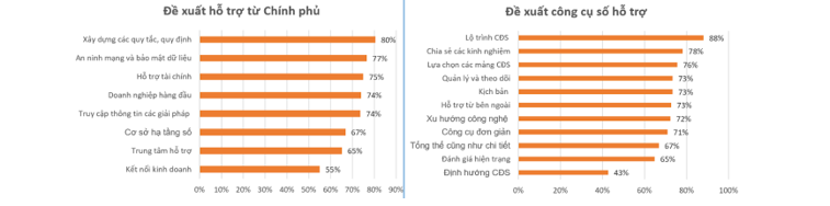 Về đề xuất cho Chính phủ, các DNVVN mong muốn có các văn bản pháp lý, chính sách cụ thể về CĐS (80%), quy định về pháp luật cụ thể liên quan đến an ninh mạng và bảo mật dữ liệu (77%) nhằm bảo vệ DN khi hoạt động trên các nền tảng số hay Internet trước các cuộc tấn công mạng. Phần lớn các DNVVN thường gặp nhiều khó khăn về tài chính khi thực hiện CĐS, nên họ cũng cần có những chính sách hỗ trợ tài chính hợp lý và đầy đủ để thực hiện CĐS (75%). Ngoài ra, DNVVN cũng mong muốn Chính phủ có chính sách hỗ trợ và khuyến khích các DN hàng đầu về CĐS ở VN chia sẻ kinh nghiệm và xây dựng các hạ tầng, nền tảng, dịch vụ hỗ trợ DNVVN (74%) hay cho phép truy cập thông tin các giải pháp cũng như cách sử dụng kỹ thuật số hiện có (74%). Bên cạnh đó, các DNVVN cũng đã đưa thêm một số đề xuất khác cho Chính phủ như: Cần có hướng dẫn chi tiết về quy trình CĐS; hỗ trợ đào tạo CĐS; có chính sách riêng đối với các DN thực hiện CĐS như: Hỗ trợ công nghệ, chuyên gia, thuế...; hỗ trợ nhân lực CĐS.