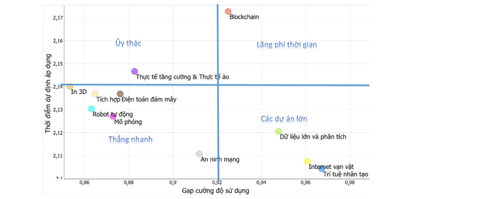 DNVVN nên ưu tiên vào nhóm công việc “thắng nhanh” vì có mức quan trọng cao cần thực hiện sớm và có nỗ lực thực hiện thấp (tức là khoảng cách giữa cường độ mong muốn và cường độ sử dụng hiện tại thấp): In 3D, Robot tự động, tích hợp hệ thống ngang và dọc, mô phỏng, điện toán đám mây và an ninh mạng. Đây cũng là một tín hiệu khá lạc quan và tích cực về nhận thức của DN đối với vấn đề an ninh mạng nhằm có những chính sách, kế hoạch và những phòng ngừa trong quá trình sử dụng các công cụ số cũng như thực hiện CĐS. Đối với công nghệ trí tuệ nhân tạo, Internet vạn vật, dữ liệu lớn và phân tích sẽ mang lại những lợi ích to lớn cho DN cũng như có thể tạo ra những đột phá và chuyển mình cho DN; tuy nhiên, để áp dụng thành công những công nghệ này đòi hỏi DN cần đầu tư nhiều hơn về thời gian, công nghệ, con người, tài chính... và có kế hoạch thực hiện một cách nghiêm túc và chi tiết. Công nghệ thực tế tăng cường và thực tế ảo nên được ủy thác cho các DN có nhiều kinh nghiệm và đội ngũ phát triển thực hiện. Riêng công nghệ Blockchain rất khó hoàn thành nên được trì hoãn lại. Blockchain chưa được quan tâm đúng mức một phần do chưa có nhiều DN trong lĩnh vực tài chính, ngân hàng trong khảo sát và Blockchain cũng đang ở giai đoạn đầu.
