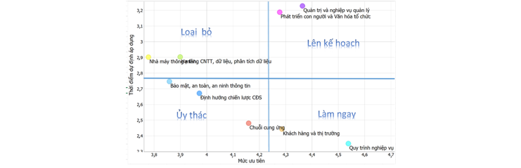 DNVVN nên tập trung thực hiện ngay CĐS cho các hoạt động chính gồm: Quy trình nghiệp vụ, khách hàng và thị trường. DN có thể thực hiện CĐS ngay cho hoạt động chuỗi cung ứng nếu DN đánh giá mức ưu tiên trên 4 là cao. Đối với các hoạt động quản trị và nghiệp vụ quản lý, phát triển con người và văn hóa tổ chức, DN nên thực hiện thận trọng và lên kế hoạch thực hiện. Đối với các hoạt động về định hướng chiến lược CĐS và an ninh thông tin mạng, DN nên ủy thác cho các công ty có nhiều kinh nghiệm hơn hỗ trợ hoặc áp dụng thuê hay mua các công cụ số có sẵn. DN chưa nên tập trung vào các hoạt động về hạ tầng CNTT, dữ liệu, phân tích dữ liệu và nhà máy thông minh vào thời điểm hiện tại. Đây cũng là một đặc điểm khá phổ biến của các DNVVN với giới hạn về thời gian và nguồn lực nên họ sẽ tập trung vào các hoạt động tạo ra lợi nhuận trước.