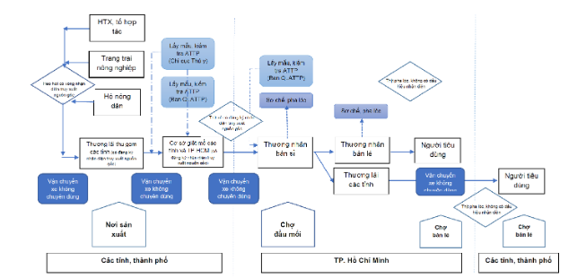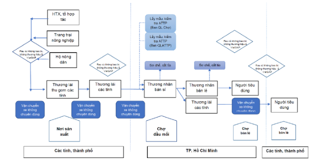 Sơ đồ 1. Kênh phân phối truyền thống của rau củ quả và các điểm nghẽn ATTP